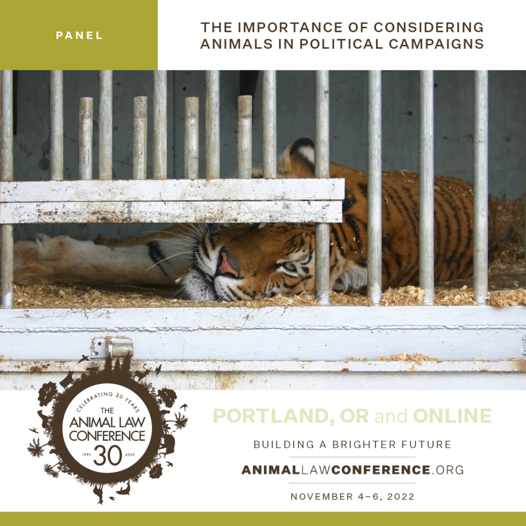 As recognition grows that animals are sentient and have their own interests, society is beginning to demand that animal welfare is considered not just in legislation but also in political campaigns. Many people are asking how their representatives in government think about animals and how they plan to protect them. The speakers on this panel will discuss how animals and animal issues play into legislative and political campaigns, looking at it from the point of view of an elected legislator, an elected prosecutor, and a lobbyist.